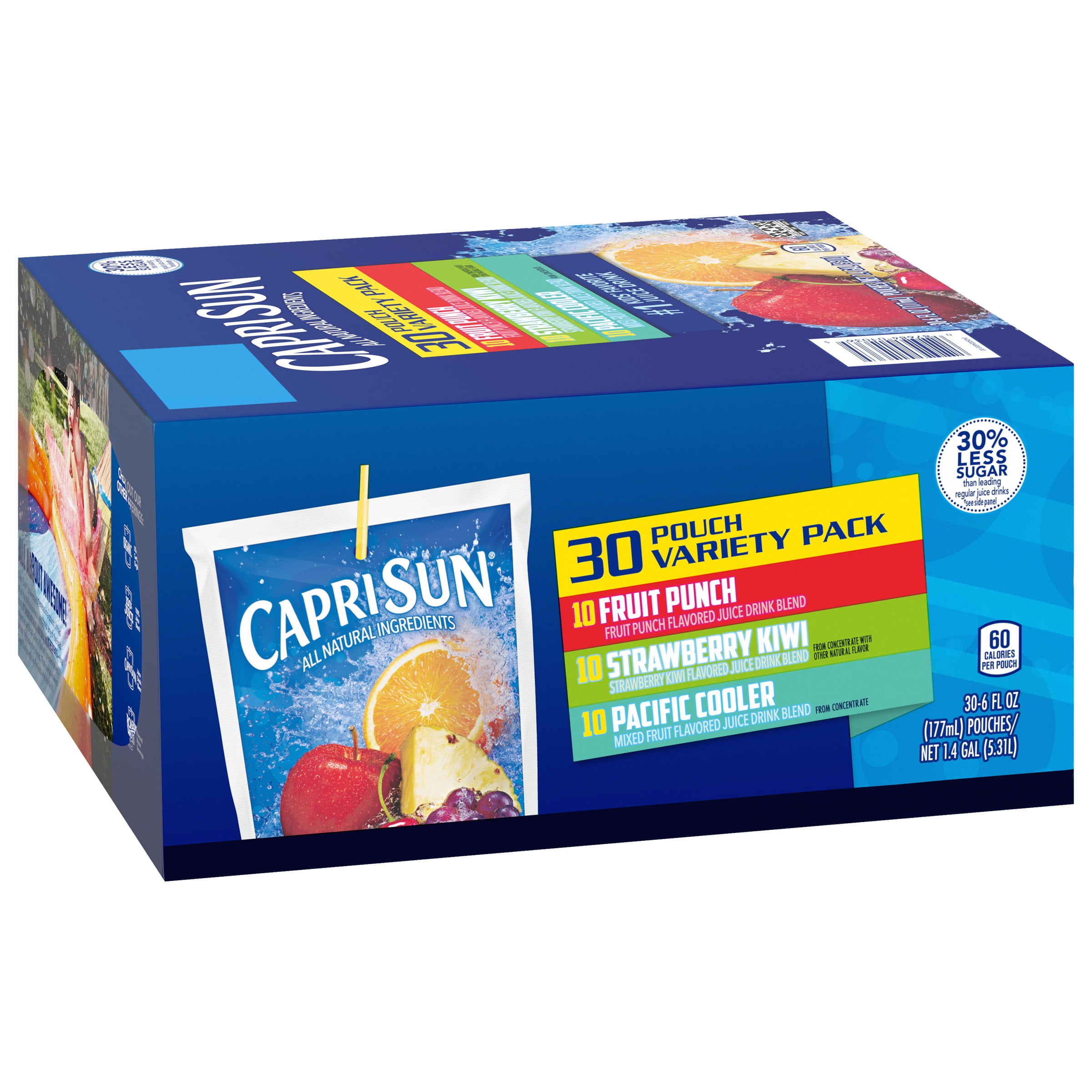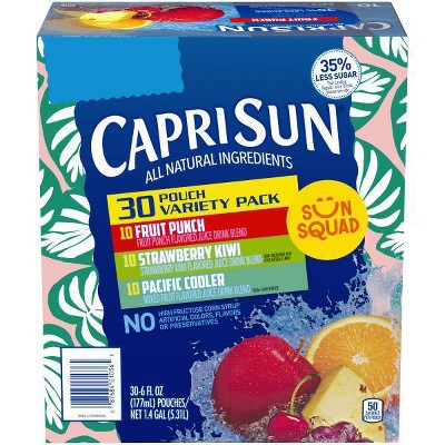 Capri Sun Fruit Punch Juice Drink Blend Value Pack 6 oz Pouches 30 pk. $8.94 ($0.30/ct) Icon details. Product description. Fruit punch flavored juice drink blend. No artificial colors, flavors, or preservatives. 25% less sugar than leading regular juice drinks. Capri Sun contains no preservatives. Preparation instructions. Best when used by date printed on side of carton.