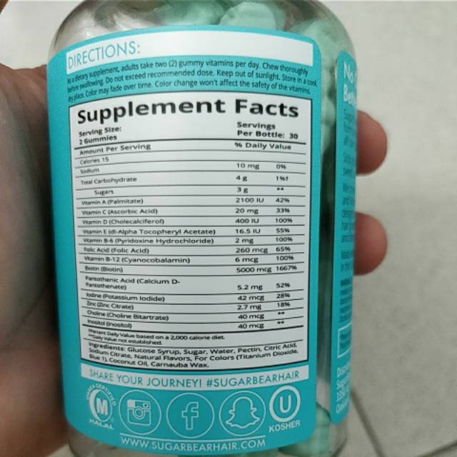 SugarBearVitaminCare.com - Revolutionary Hair Vitamins - Sugarbear ... VITAMIN-INFUSED HAIR CARE Sugarbear Hair Vitamin Gummies - 1 Month $34.99 Sugarbear Hair Vitamins - 3 Month Pack + Free Gift $89.99 $104.97 Sugarbear Hair Vitamins - 6 Month Pack + Free Gift $169.99 $200.94 Sugarbear Hair Vitamins - 8 Month $199.99 $279.92 VITAMIN-INFUSED LASH CARE What's Actually In SugarBearHair, The Kardashians' Favorite Hair Vitamin The amount of each vitamin more than meets the FDA's CFR Part 111's dosage requirements to ensure SugarBearHair's label accuracy." Labdoor's testing found the bears contain 70% more biotin than claimed on the label and about 75% the amount of vitamins B5 and B6, which have been associated with hair growth.