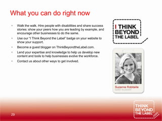 Website: Think Beyond the Label | The Arc's Autism Now Center Think Beyond the Label delivers information, outreach and resources to businesses, job seekers and the public workforce system to ensure greater recruiting and hiring opportunities for job candidates with disabilities. Through its website, it offers a jobs portal where job seekers can connect with potential employers and shares success stories. ...