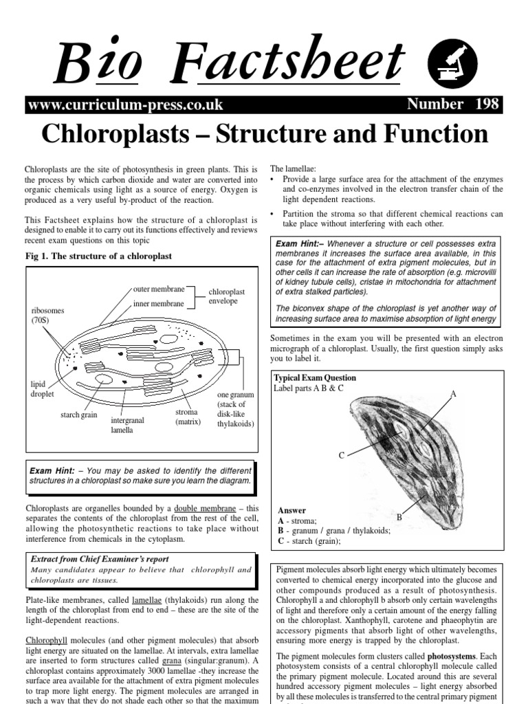 PDF 198 Chloroplasts SF - CXC® CAPE® Biology Resources For Caribbean Students Chloroplasts - Structure and Function Chloroplasts are the site of photosynthesis in green plants. This is the process by which carbon dioxide and water are converted into organic chemicals using light as a source of energy. Oxygen is produced as a very useful by-product of the reaction. This Factsheet explains how the structure of a ...