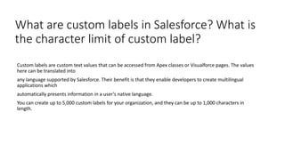 Salesforce custom label character limit. Learn What’s New for Platform Developers - Salesforce In the hands-on challenge below, you'll have an opportunity to work with the new Custom Metadata getInstance method to replace SOQL. Launch the org you'll use for the hands-on challenge, then do the following. Create a Custom Metadata Type. Label: Country Code; Plural Label: Country Codes; Add a Custom Field. Data Type: Text; Field Label ...