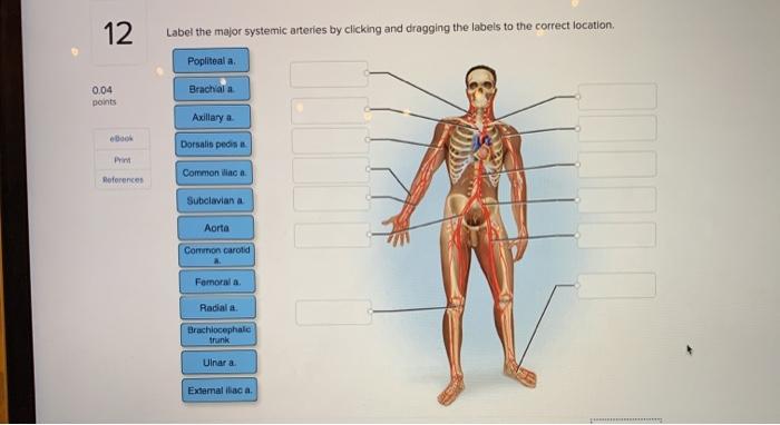 Solved Label the major systemic arteries by clicking and - Chegg Transcribed image text: Label the major systemic arteries by clicking and dragging the labels to the correct location. 7 Ulnar a. Aorta Brachial a. Femoral a Common carotid a. External iliac a Common iliac Popliteal a. Dorsalis pedis a. Radial a Brachiocephalic trunk Axillary a Subclavian a Previous question Next question Major Arteries and Veins - Human Anatomy - GUWS Medical Label the major arteries and veins indicated in figure 46.11. Figure 46.11 Label the major arteries and veins of the systemic and pulmonary circuits. Right lung. Liver. Right kidney. Figure 46.11 Label the major arteries and veins of the systemic and pulmonary circuits. Right lung. Liver. Right kidney. Deep femoral artery. Urinary bladder ...