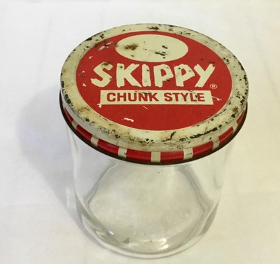 Vintage 1940s Skippy Peanut Butter Jar and Lid Vintage 1940s Skippy Peanut Butter Jar and Lid $ 14.00 USD Sold out Pay in 4 interest-free installments for orders over $50 with Learn more Quantity Sold out Free shipping for orders over $ 100.00 ! Just $ 100.00 left If you're a peanut butter lover, like me, you'll love this. Glass jar with Skippy lid, circa the 40s, or so.