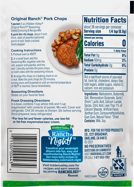 Hidden Valley Original Ranch Seasoning & Salad Dressing Mix, dry * The % Daily Value (DV) tells you how much a nutrient in a serving of food contributes to a daily diet. 2,000 calories a day is used for general nutrition ...